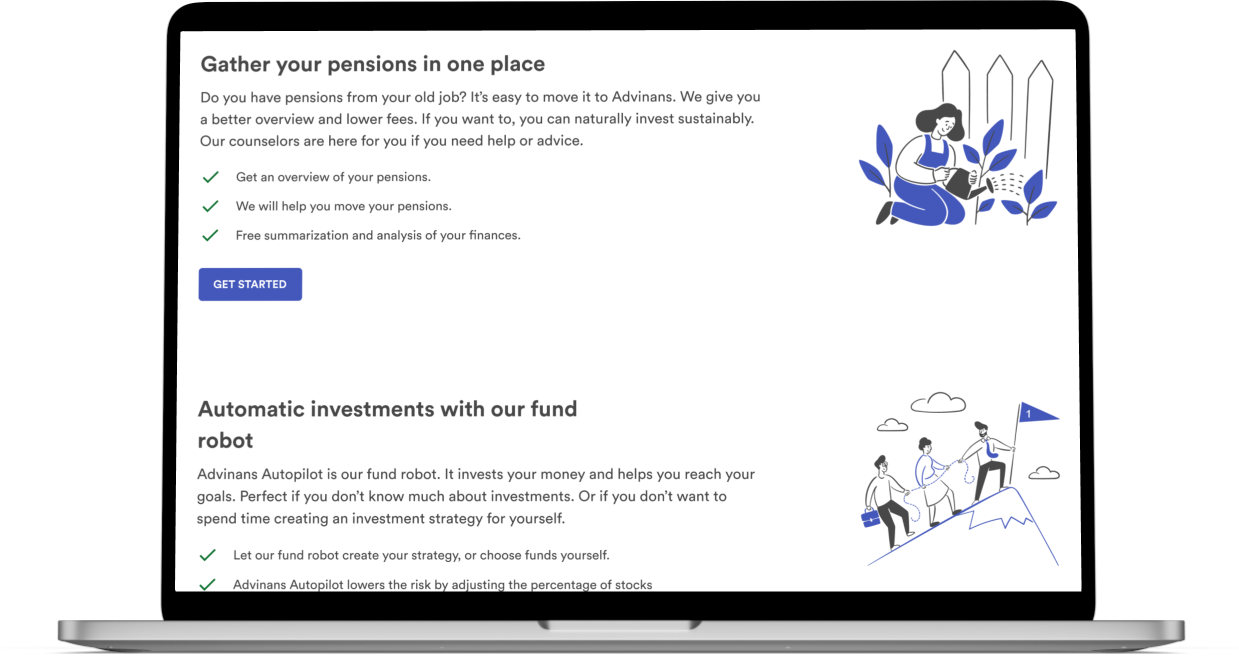 Advinans is a company that handles people’s pensions and other personal savings, and places their money in different funds and stocks. The first screens shown here are different versions of hero banners they were planning to use across their site to gain new customers.